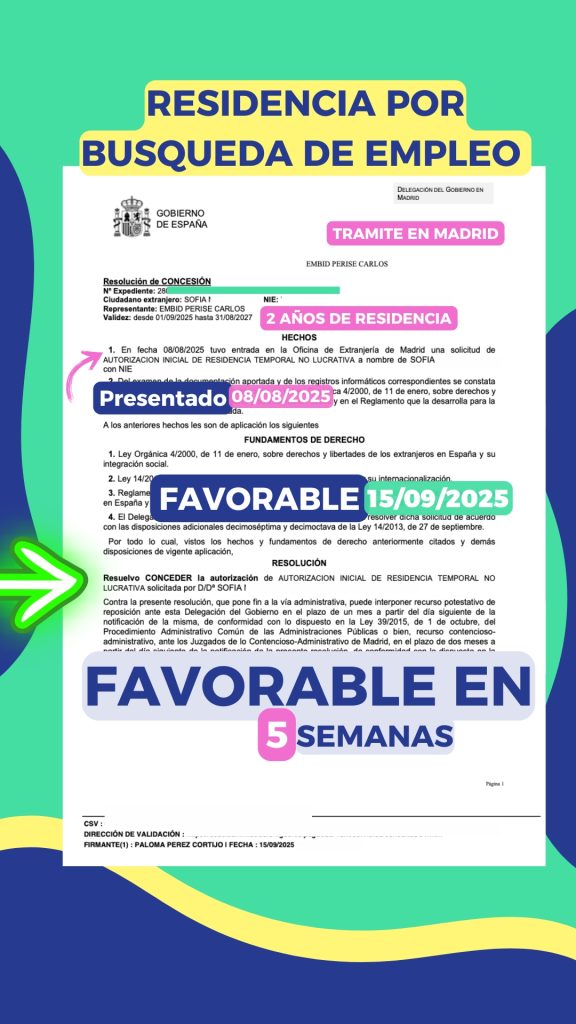 En EUROHISPANA Abogados estamos de enhorabuena ????. El 8 de agosto de 2025 presentamos en Madrid un trámite de modificación de estancia por estudios a residencia por búsqueda de empleo para una clienta, y en apenas 5 semanas ya se resolvió favorable. Ahora cuenta con una autorización de residencia en España por 2 años, que le abre nuevas oportunidades de estabilidad y futuro en el país.