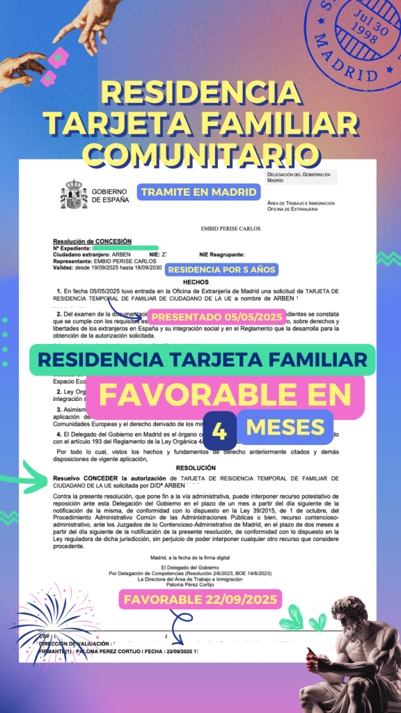 Uno de nuestros casos recientes fue el de Arben, a quien primero le gestionamos la inscripción de la pareja de hecho con su pareja europea y, posteriormente, presentamos su residencia el 5 de mayo de 2025. Apenas 4 meses y medio después, recibió una resolución favorable.
